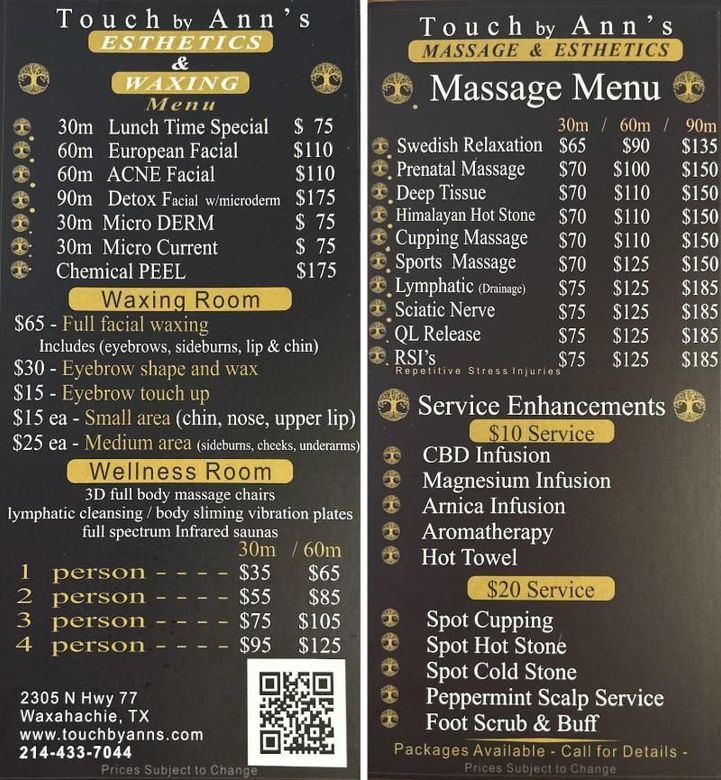 Discover holistic healing at Touch by Ann's Massage Studio, your therapeutic massage studio in Waxahachie, TX. Our expert therapists offer a range of services, including Swedish relaxation massage, deep tissue massage, couples massage, sports massage, and more. We also provide state-of-the-art 3D full-body massage chairs, a full spectrum infrared sauna, and body slimming vibration plates. As a local family-owned business, we pride ourselves on competitive pricing and delivering the best value in Waxahachie. Trust us to address the root of your discomfort and help you get back to doing what you love. Schedule your session today for a holistic approach to pain management and wellness!